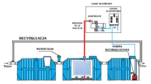 Kompresor umieszczony na zewnątrz urządzenia dostarcza konieczny tlen za pomocą dyfuzorów umieszczonych na dnie zbiornika.