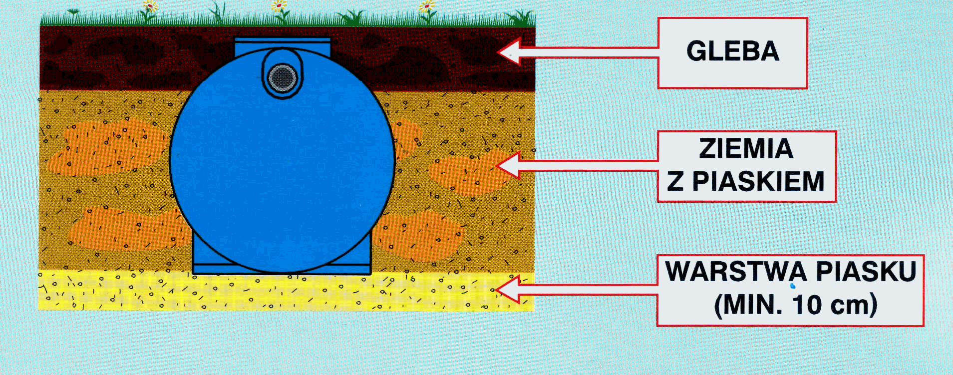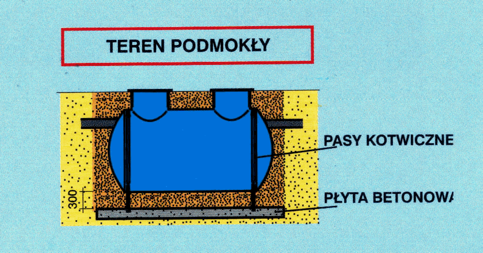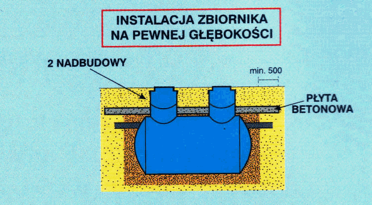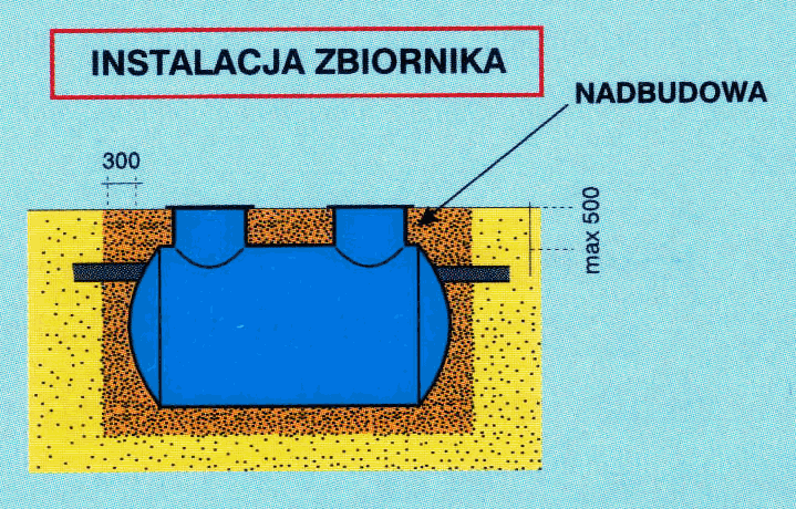 Zbiornik musi być posadowiony na 30-to centymetrowej warstwie piasku. Przestrzeń (min. 30 cm) pomiędzy zbiornikiem a ścianami wykopu musi być wypełniona mieszanką piasku z cementem w proporcji: 50 kg cementu na 1 m3 piasku. Ilość cementu na m3 piasku wzrasta proporcjonalnie do zagrożenia "podejścia" osadnika wodami gruntowymi. Zbiornik należy stopniowo napełnić wodą w miarę zasypywania wykopu.