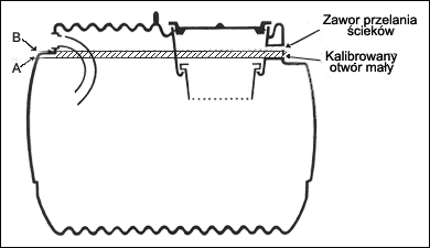 Zawór dekompresyjny; w naszym osadniku gnilnym zawór ten (jak pamiętamy, umożliwiający wydostanie się gazów z osadnika do wentylacji budynku) znajduje się na płaszczyźnie równoległej wlotu. Dzięki temu położeniu nie może on ulec zatkaniu przez części stałe ścieków w momencie ich wpływu. W wielu istniejących na rynku polskim modelach osadnika, zawór ten znajduje się na zgięciu - i jest bardzo wrażliwy na zatkanie. Może to spowodować oprócz zamknięcia dekompresji, również zatkanie wlotu.
